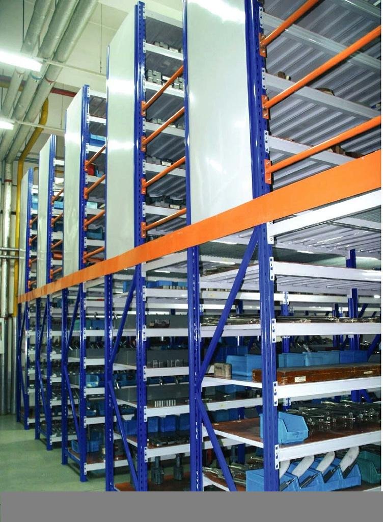 阁楼货架的结构 阁楼货架系统,通常利用中型搁板式货架或重型搁板式货架作为主体支撑加上楼面板(根据货架单元的总负载重量来决定选用何种货架),楼面板通常选用冷轧型钢楼板、花纹钢楼板或钢格栅楼板。近几年多使用冷轧型钢楼板,它具有承载能力强、整体性好、承载均匀性好、精度高、表面平整、易锁定等优势.有多种类型可选,并且易匹配照明系统,存取、管理均较为方便。单元货架每层载重量通常在500kg以内,楼层间距通常为2.2m~2.7m,顶层货架高度一般为2m左右,充分考虑工作人员操作的便利性。